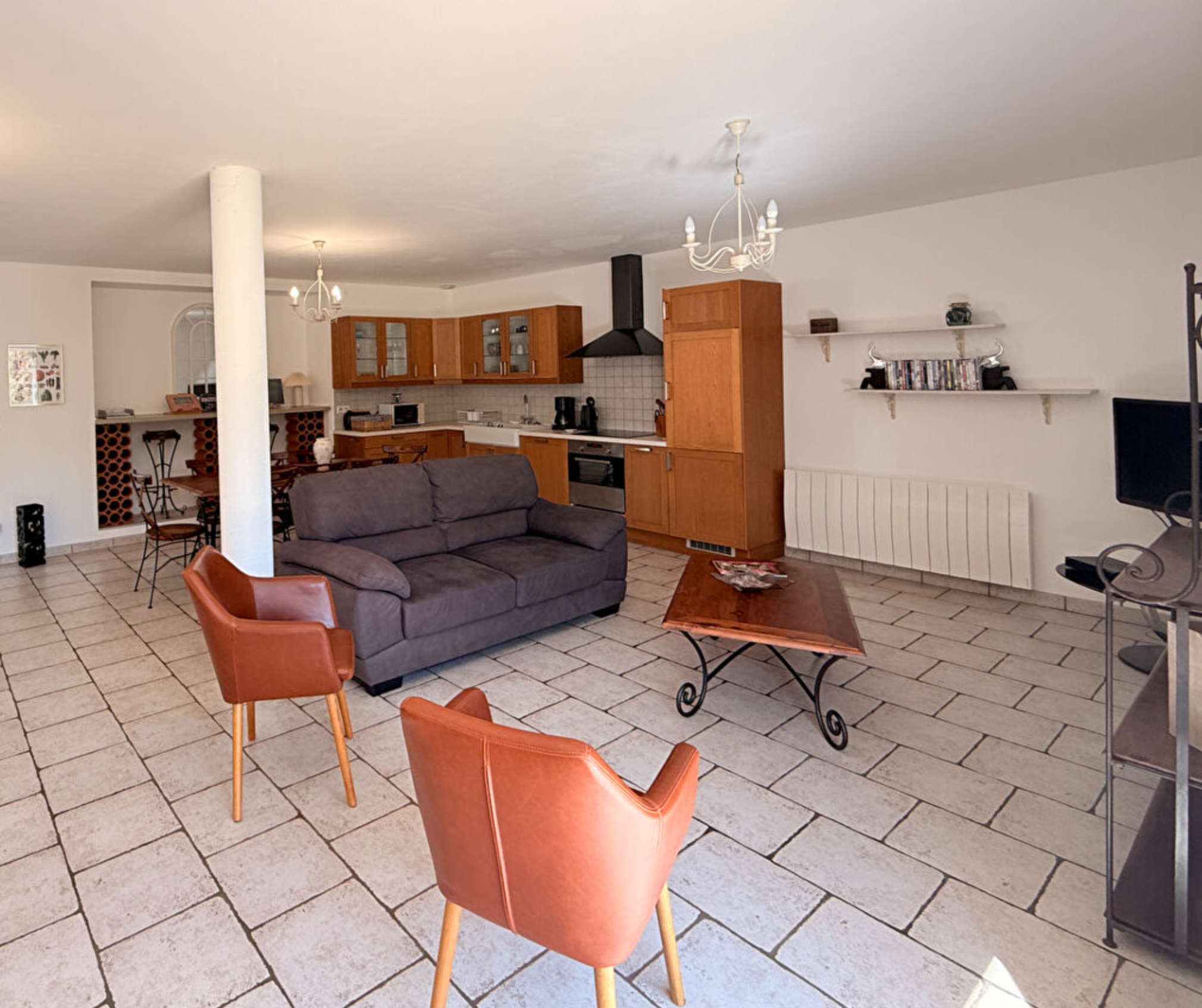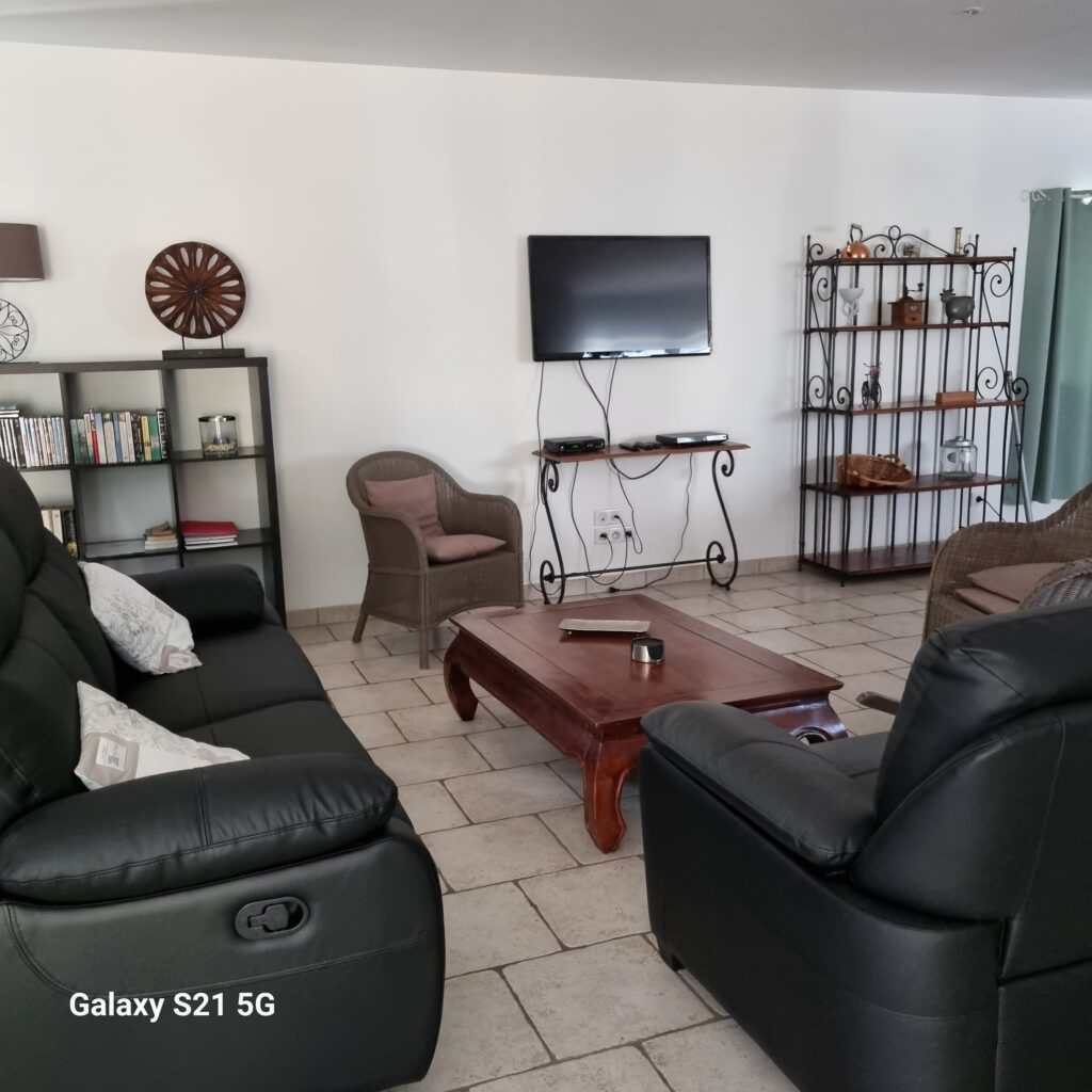 Canapé et fauteuil, table basse, TV écran plat et lecteur DVD