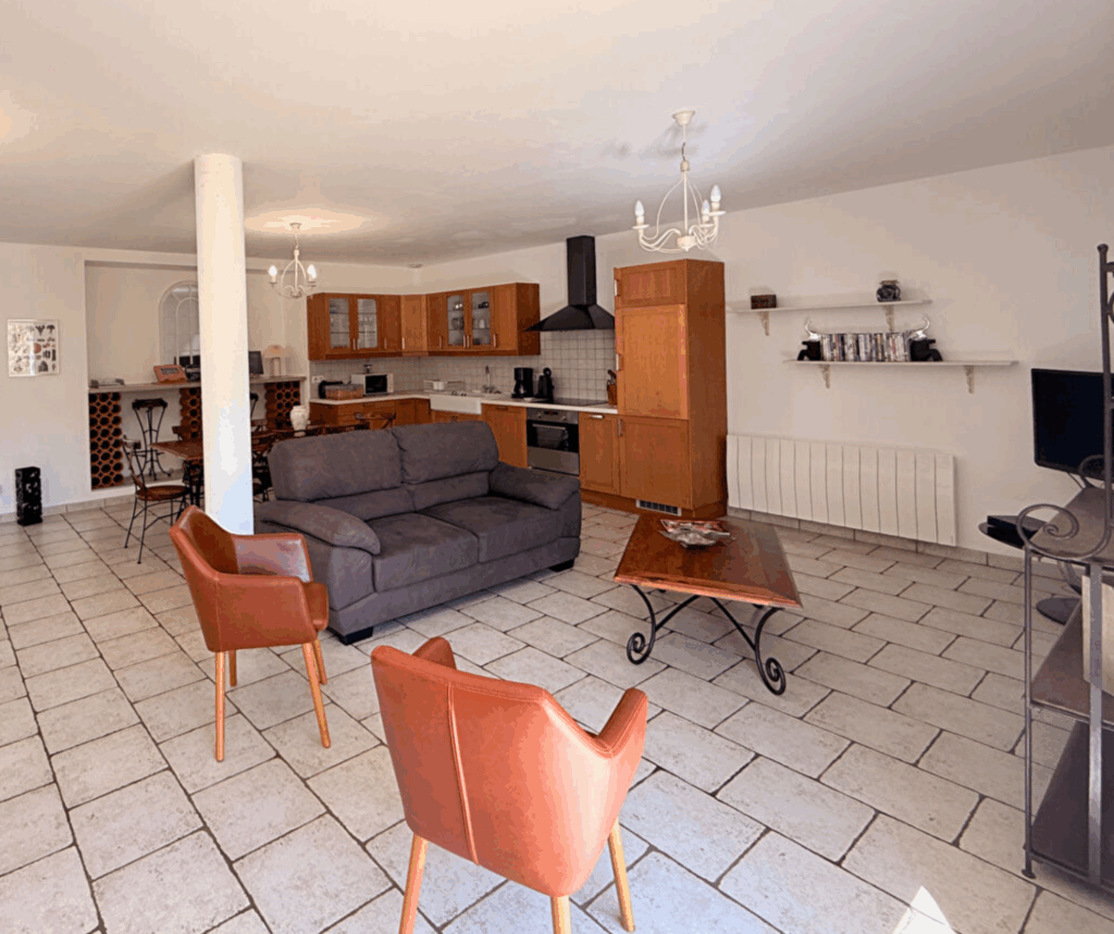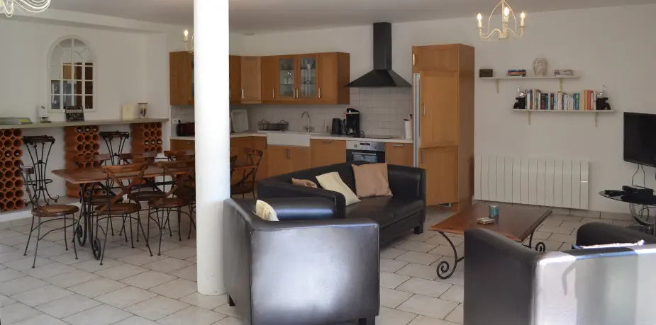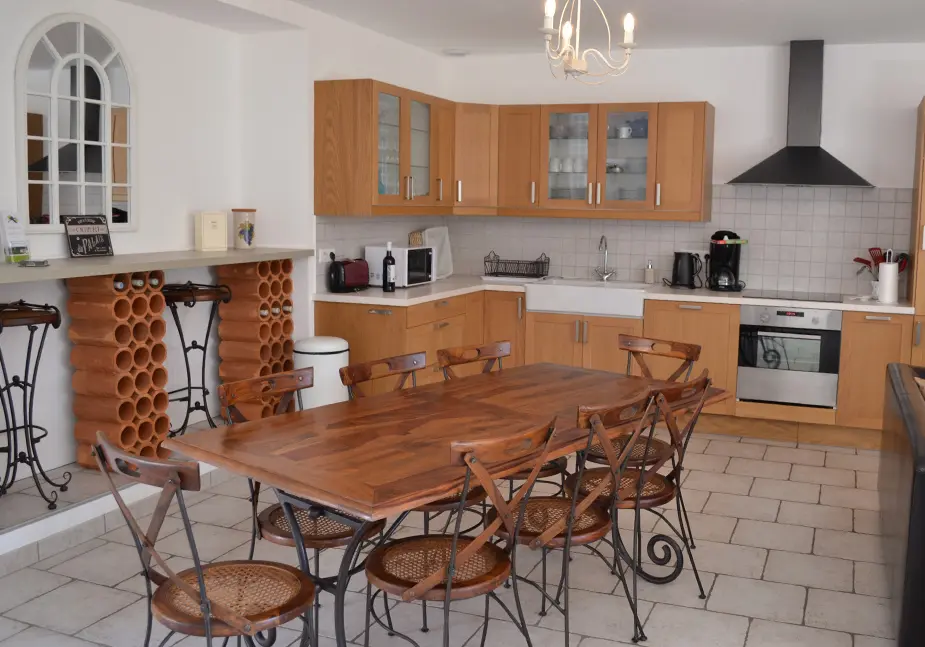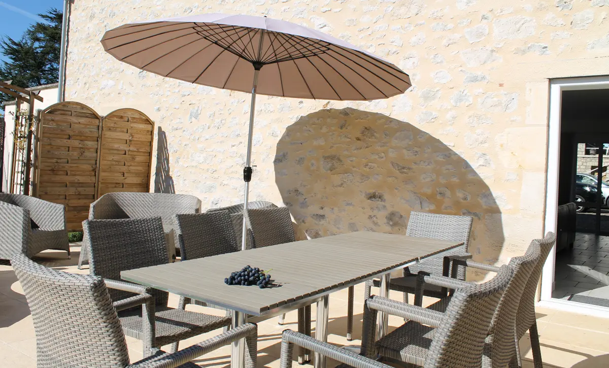 Le gîte « Le Potager » est également équipé d’une terrasse dallée et claustra avec une vue magnifique sur la vigne et agrémentée d’une table et chaises de jardin mais aussi d’un salon extérieur avec fauteuils, table basse et transats.
